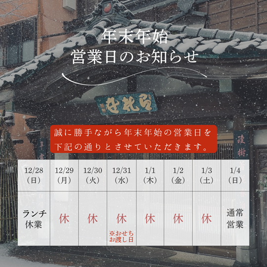 上越・高田御城下、百年の味わい。 令和8年1月4日(日)~1月8日(木)の期間は 「おせちランチ(ミニおせち二段重+お雑煮)」をご用意して 皆様のお越しをお待ちしております。 おせちランチ 3,980円(甘味・コーヒー付 […]