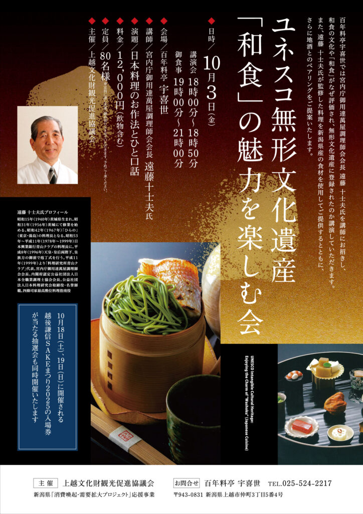 また、新潟県産の食材をふんだんに使用した、遠藤先生監修のお料理をお楽しみいただきながら、上越の地酒とのペアリングもご提案いたします。